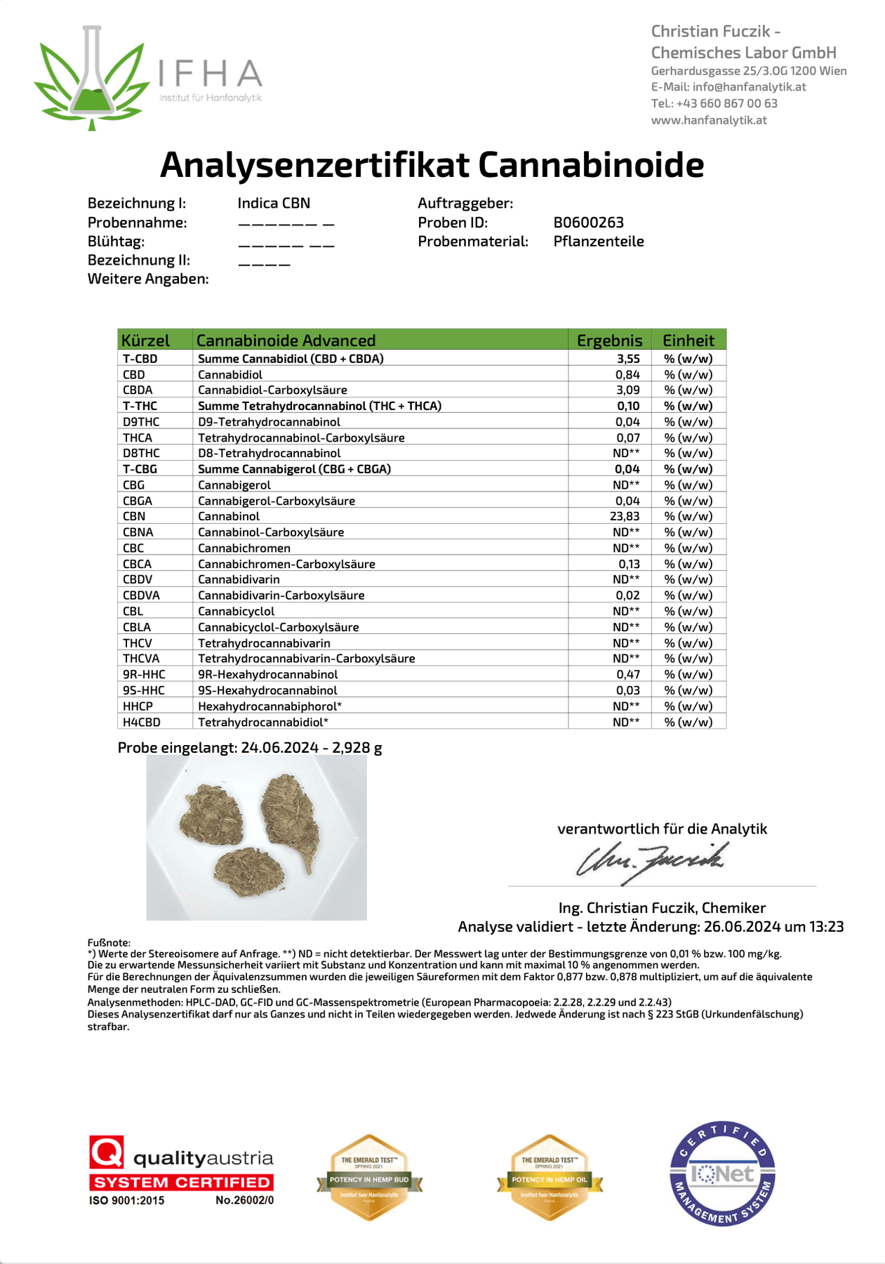 Bei einem so potenten Produkt ist Vertrauen essenziell. Jede Charge unserer CBN-Indica-Blüten wird von einem unabhängigen österreichischen Labor untersucht. Die Analysen bestätigen: